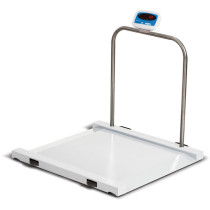 This electronic chair scale was designed for either walking on or being wheeled on to be weighed. The scale provides accurate weight with an easy-to-read LED display.